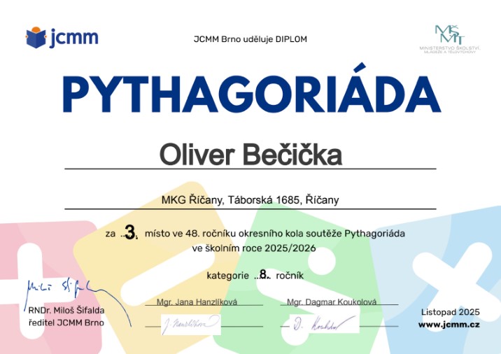 V úterý 11. 11. 2025 se ti nejlepší z úspěšných řešitelů školního kola Pythagoriády zúčastnili kola okresního, které proběhlo na Gymnáziu Říčany na Komenského náměstí. Z primy A Erik Dohnal, Beata Klein, Daniela Shrbená, ze sekundy Ondřej Marek a z tercie Oliver Bečička. Všem děkujeme za vzornou reprezentaci školy a těm nejlepším gratulujeme! V kategorii mladších žáků zvítězila Daniela Shrbená a 2. místo obsadila Beata Klein. V kategorii starších žáků obsadil 3. místo Oliver Bečička. Radujeme se z vašeho úspěchu.